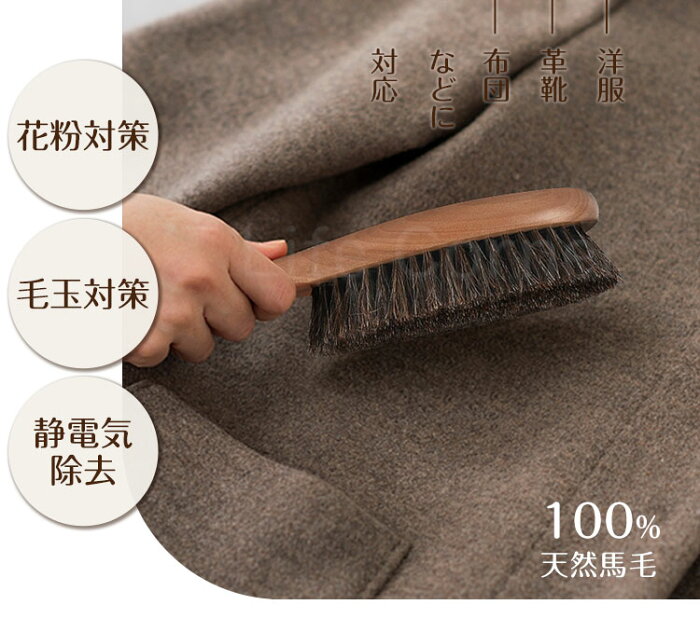 馬毛ブラシの清潔力は強いし、馬毛ブラシは細かいところまで入り、花粉や埃が落ちる、洋服ブラシとしてソファー、布団、靴などにもきれいに掃除できます。