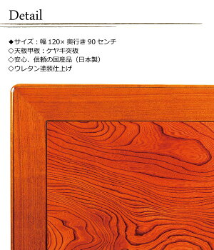 ◆サイズ:幅120×奥行き90センチ ◇天板甲板:ケヤキ突板 ◇安心、信頼の国産品(日本製) ◇ウレタン塗装仕上げ ※こちらの商品はご注文いただいてから1日〜2日(土日除く)での発送となります ◇このシリーズには「90角正方形」「105幅長方形」「120幅長方形」「135幅長方形」「150幅長方形」の5タイプがございます。