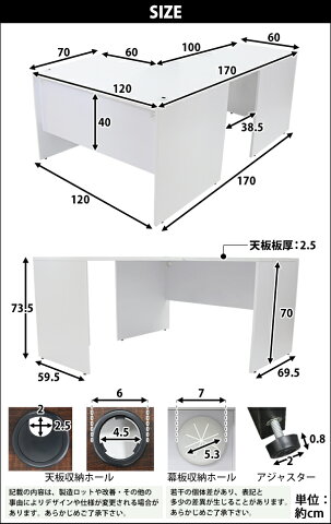 本体寸法 W約120×D約170×H約73.5(cm) 梱包寸法(2個口) デスク:W約148×D約80×H約10(cm)サイドデスク:W約70×D約107×H約12(cm) 材質 パーティクル(パーチクル)ボード(メラミン加工)(本体、サイドデスク)、プラスチック(アジャスター、配線収納ホール) 重量 約52kg(デスク:約31kg、サイドデスク:約21kg) 商品について ●こちらの商品は、新品ではありますが、輸入品につき、多少のスリ傷等ある場合もございます。