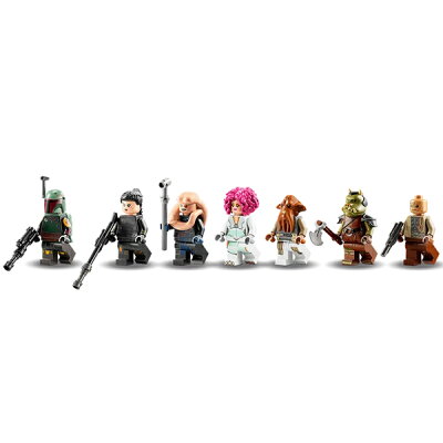充実のセット内容は、ミニフィギュア7体(ボバ・フェット、フェネック・シャンド、ビブ・フォーチュナ、シーリンのダンサー、ウィークウェイ・ガード、ガモーリアン・ガード、クオレン)と、各種の武器が付属しています。
