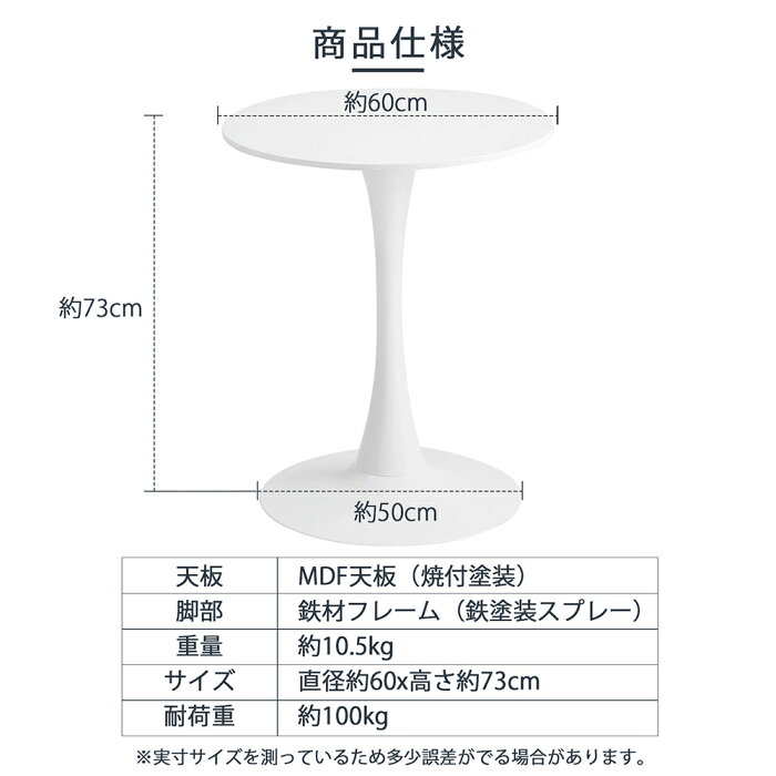 商品仕様 天板:MDF天板(焼付塗装) 脚部:鉄材フレーム(鉄塗装スプレー) 重量:約10.5kg サイズ(約):直径60cm×高さ73cm 耐荷重:約100kg 組立有無:あり セット内容 テーブル×1 ネジ×10 レンチ×1 組立図×1 注意事項 ※入荷時期により、パッケージデザイン・配線色など、商品の機能・性能に直接関係しない部分での仕様は予告無く変更される場合がございます。
