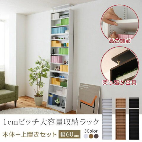 1cmピッチ 薄型 大容量 文庫本ラック 幅60 上置きセット 書棚 壁面収納 つっぱり 木製 本収納 漫画 CD DVD【QSM-60】 m031-khy-0214set