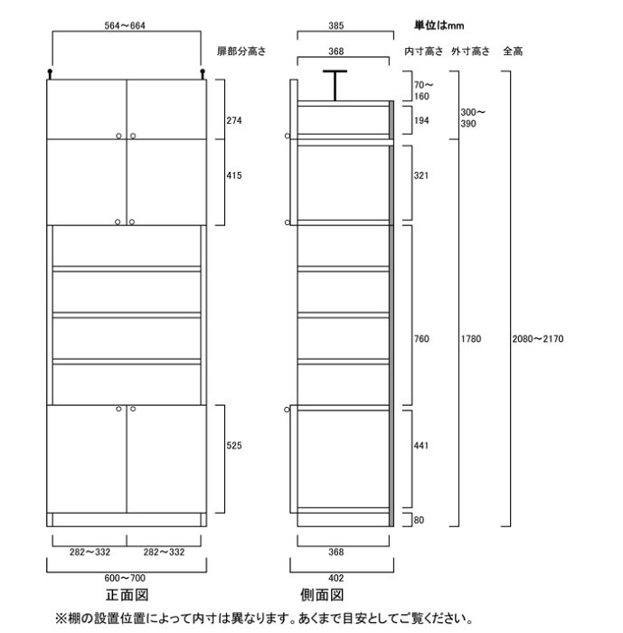 リビング壁面収納棚高さ208〜217cm幅60〜70cm奥行40cm厚棚板(棚板厚2.5cm) 本体棚扉サイズ:上扉41.5cm+下扉52.5cm(高さ=ラック高さ178cm+突張棚高さ23cm+伸縮突張金具)飾り棚付両開き扉リビング壁面収納棚