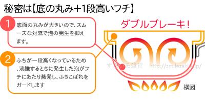 (2)フチが一段高くなっているため、沸騰する時に発生した泡がフチにあたり蒸発し、 ふきこぼれをガードします。